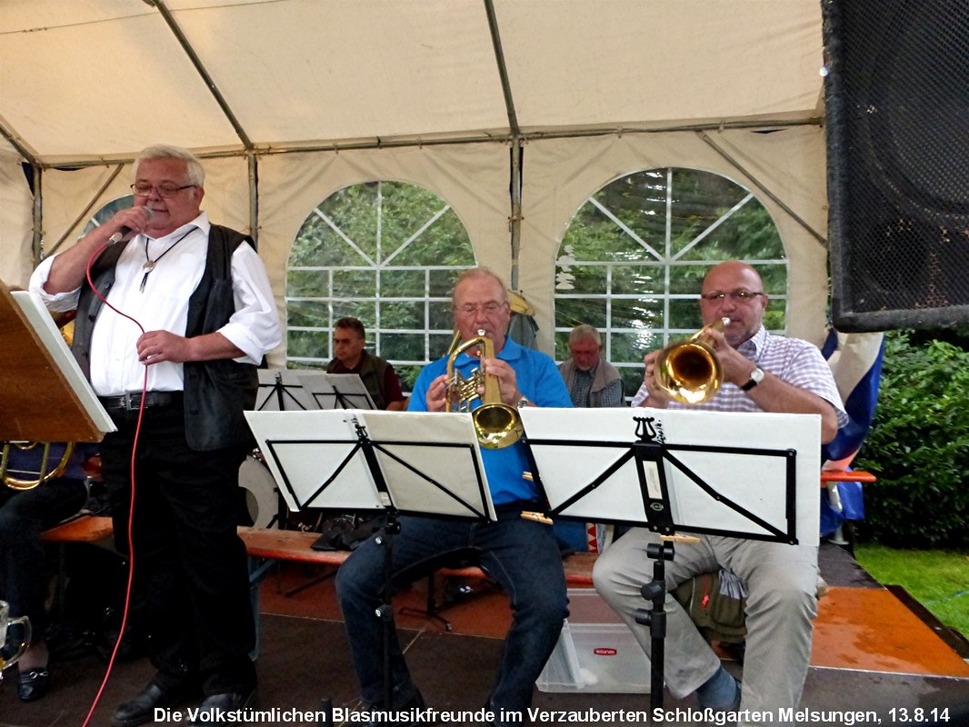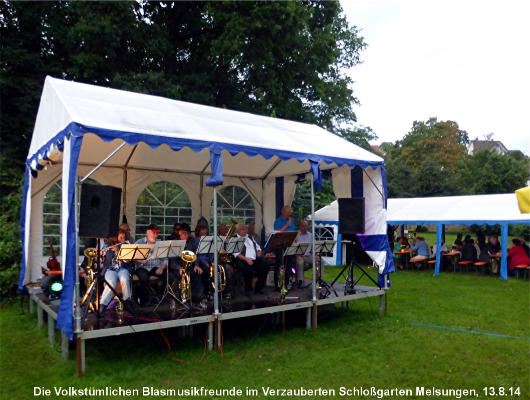 Am Mittwoch, 13.August gastierten die Blasmusikfreunde im Verzauberten Schloßgarten in Melsungen. Trotz des angekündigten Regens hatten sich zahlreiche Blasmusikfans eingefunden und erfreuten sich an der schönen Blasmusik mit Gesang.