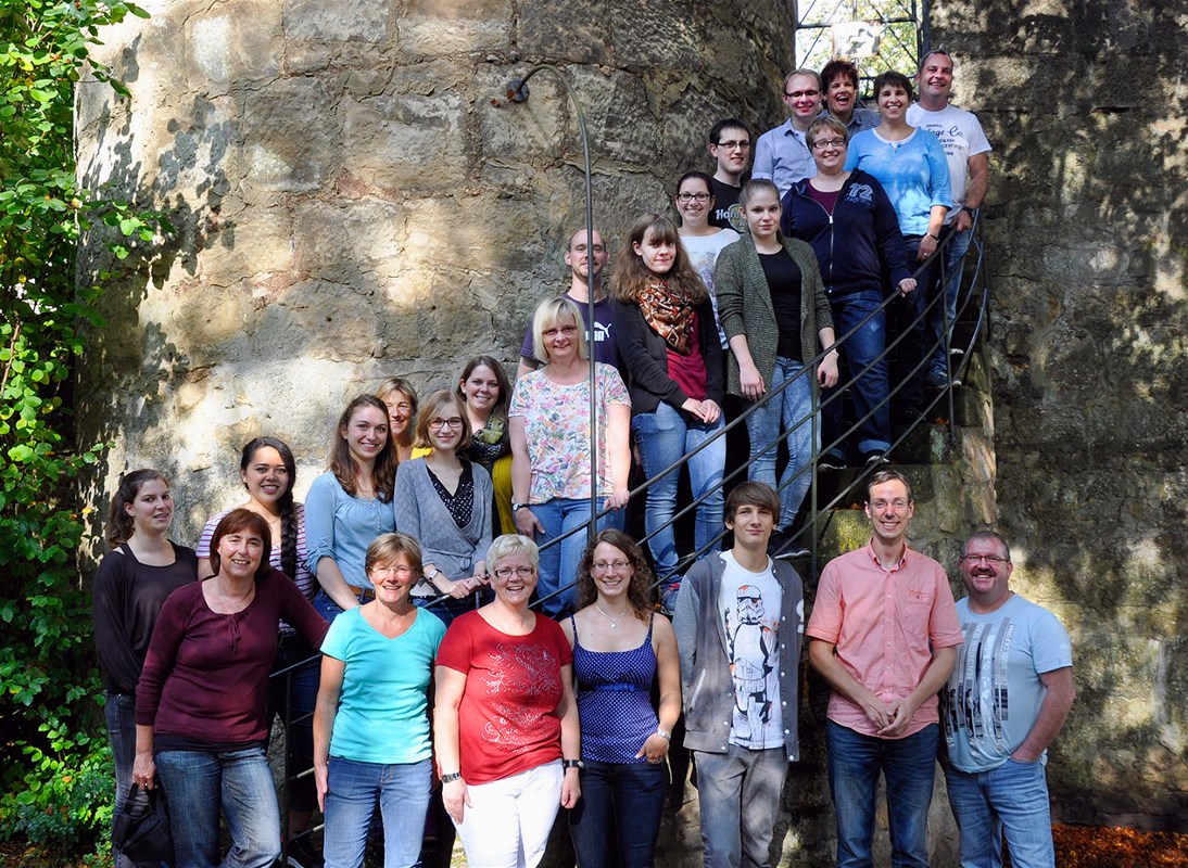 Gruppenfoto auf der Wendeltreppe am Enser Tor direkt neben der Jugendherberge in Korbach.