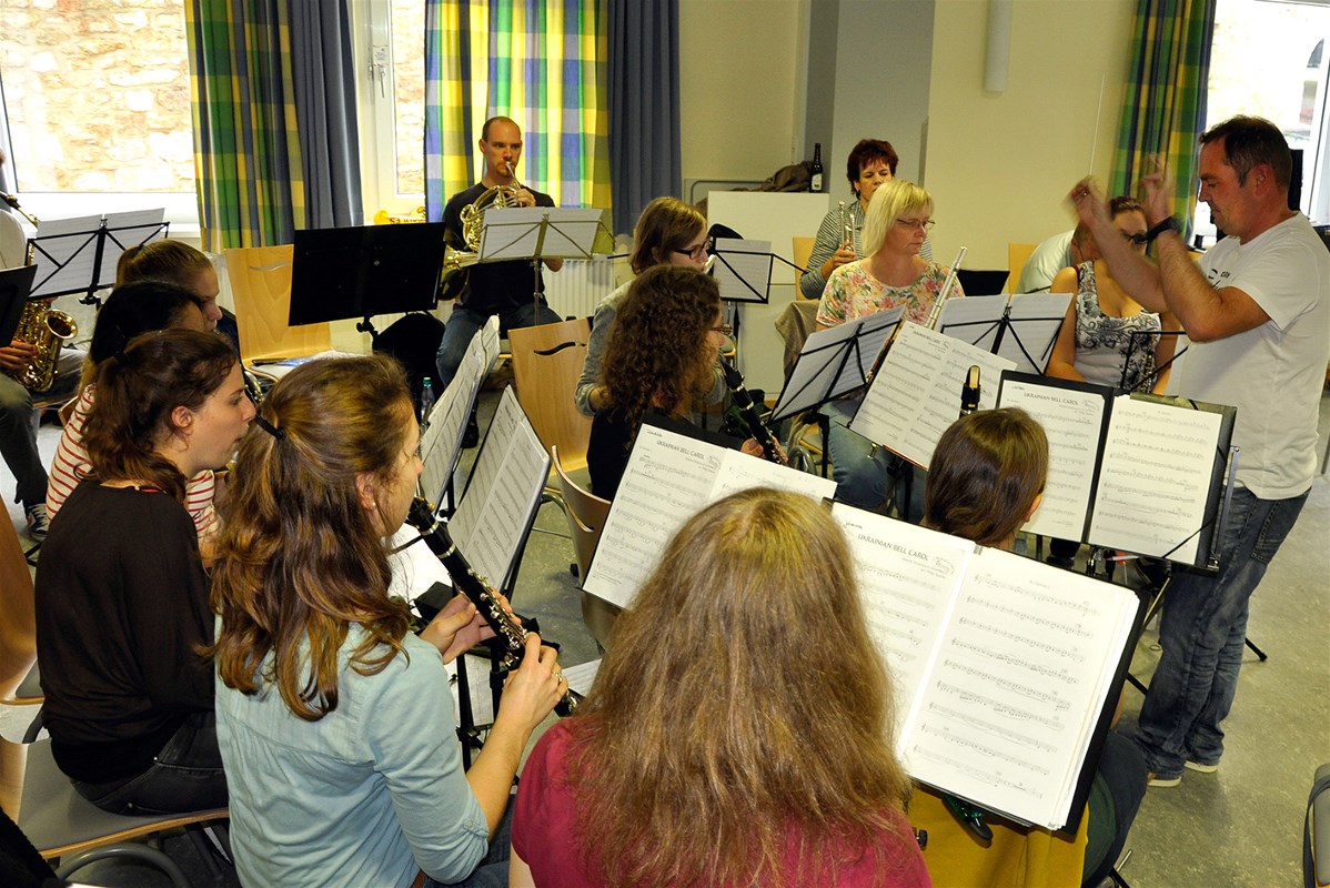 Das Blasorchester Brunslar beim Proben am Samstag, 20. September, in der Jugendherberge in Korbach, rechts: Dirigent Torsten Eckerle.