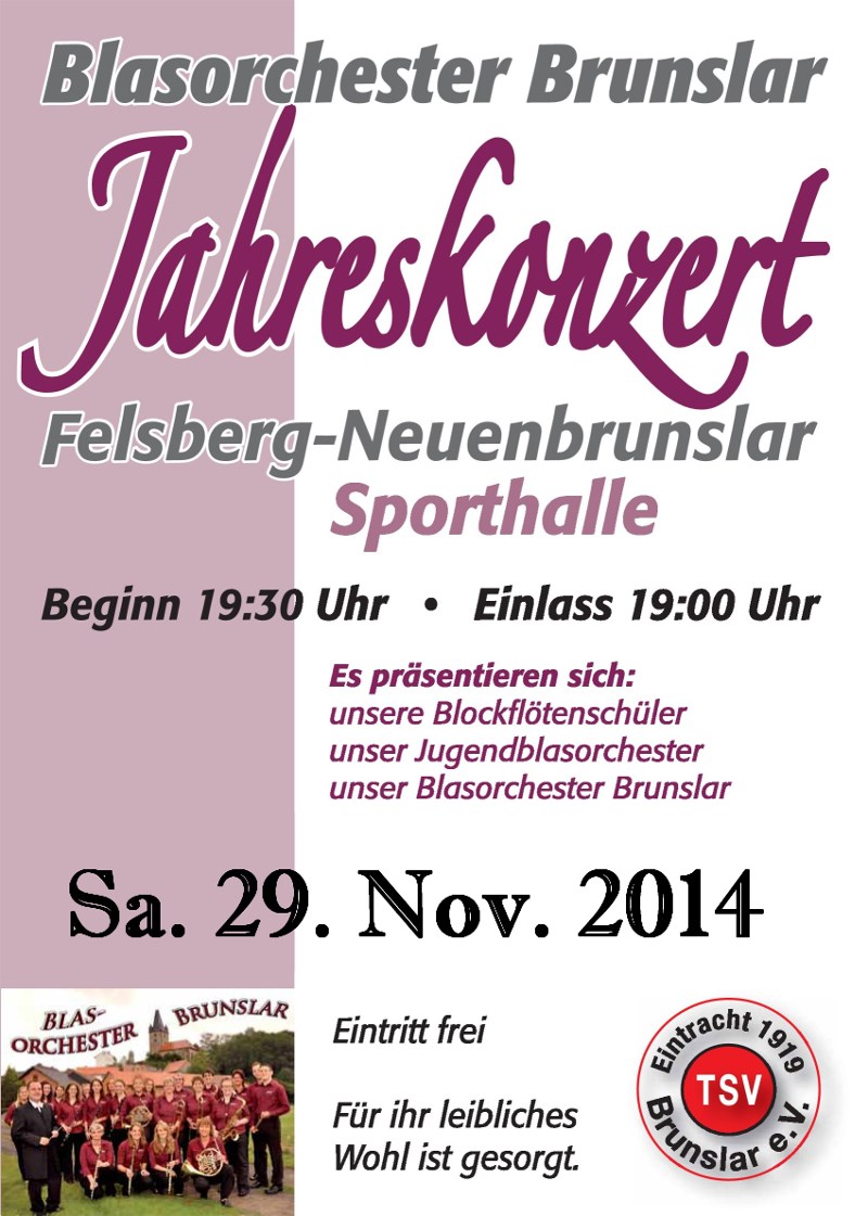 Mit einem glanzvollen Jahreskonzert 2014 begeisterte das Blasorchester Brunslar am Vorabend des 1. Advent vor vollem Haus in der Sporthalle Brunslar.