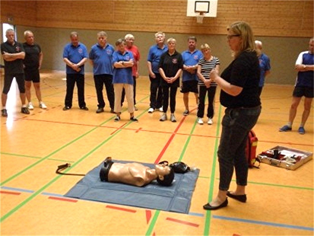 Die Herzsportler ließen sich am 10.6. im Anschluss an ihr Training über die Herz-Lungen-Wiederbelebung informieren. Dazu hatte Notfall-Ärztin Frau Discher einen Dummy als Übungspuppe mitgebracht und erklärte den Teilnehmern den aktuellen Stand der Wiederbelebung.