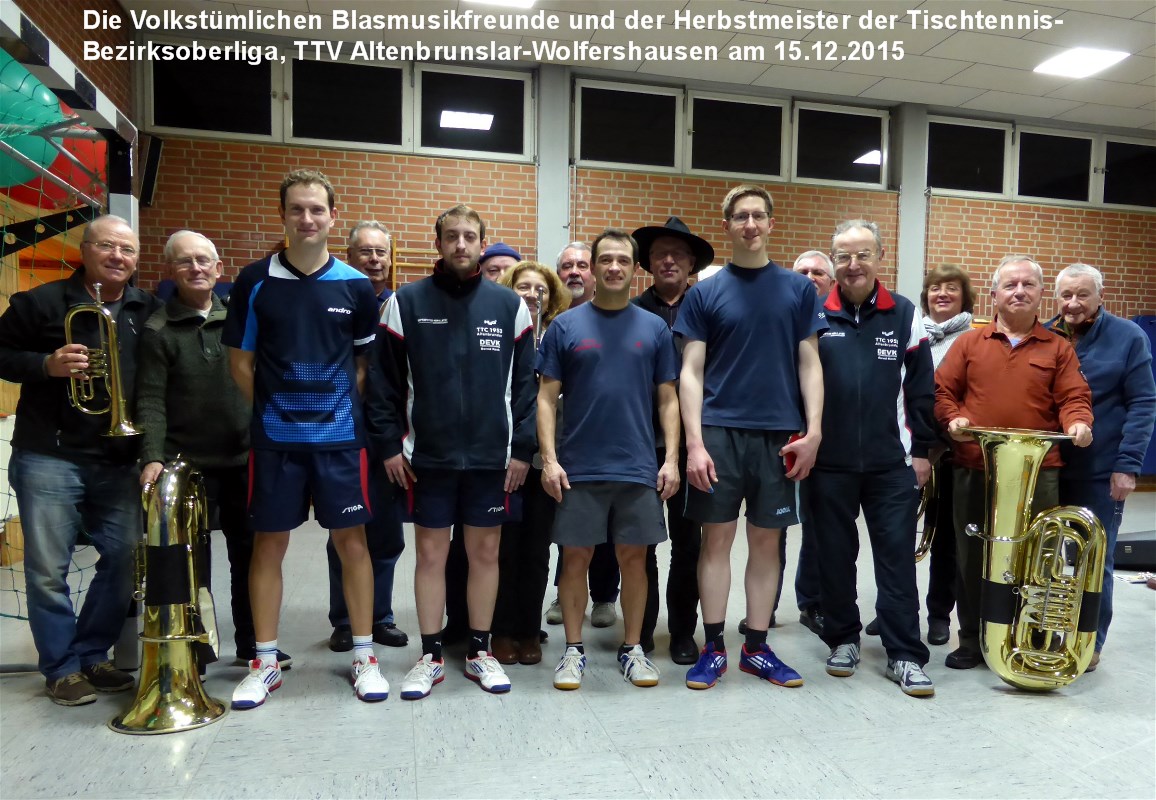 Als Herbstmeister der Tischtennis-Bezirksoberliga konnte die 1. Mannschaft des TTC 09 Altenbrunslar-Wolfershausen ihren Tabellen-Spitzenplatz mit in die Weihnachtspause nehmen. Beim Training der Mannschaft am 15.12., war das den Volkstümlichen Blasmusikfreunden, gerade bei ihrem Probenabschluss nebenan in der kleinen Sporthalle, ein Gratulationsständchen wert. Mit der Polka „Jeder Tag bringt neue Hoffnung“ hoffen sie auf den nötigen Motivationsschub, dass das Tischtennisteam am Ende der Serie letztlich als Meister der Bezirksoberliga hervorgeht.