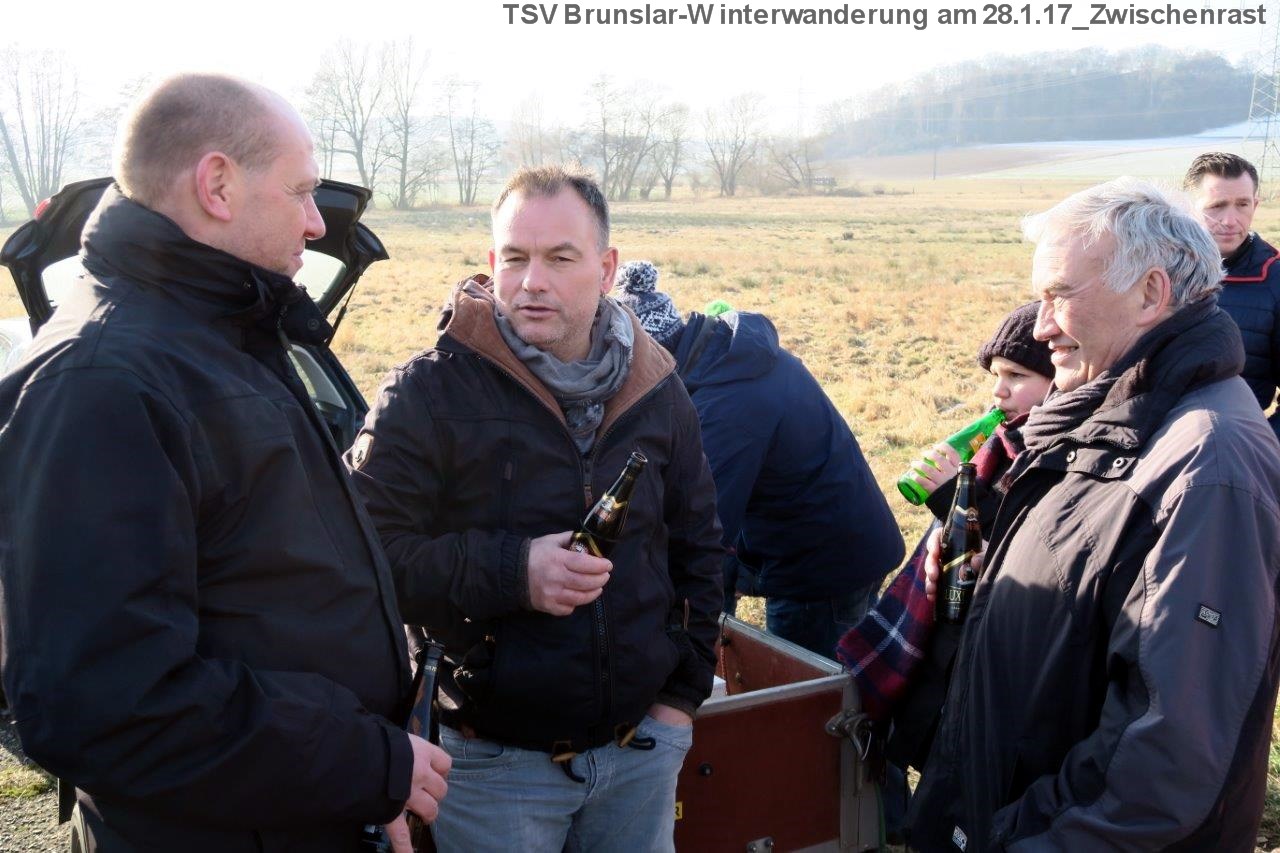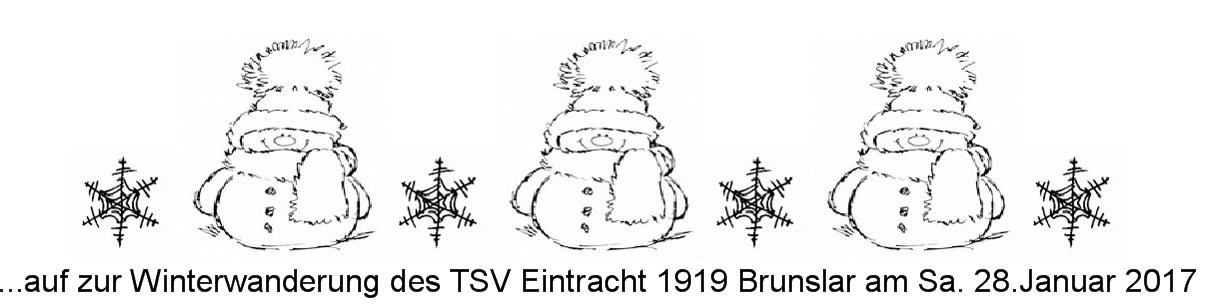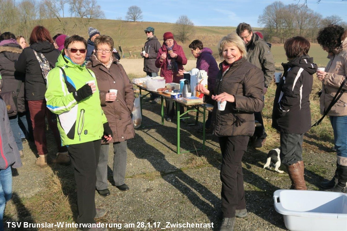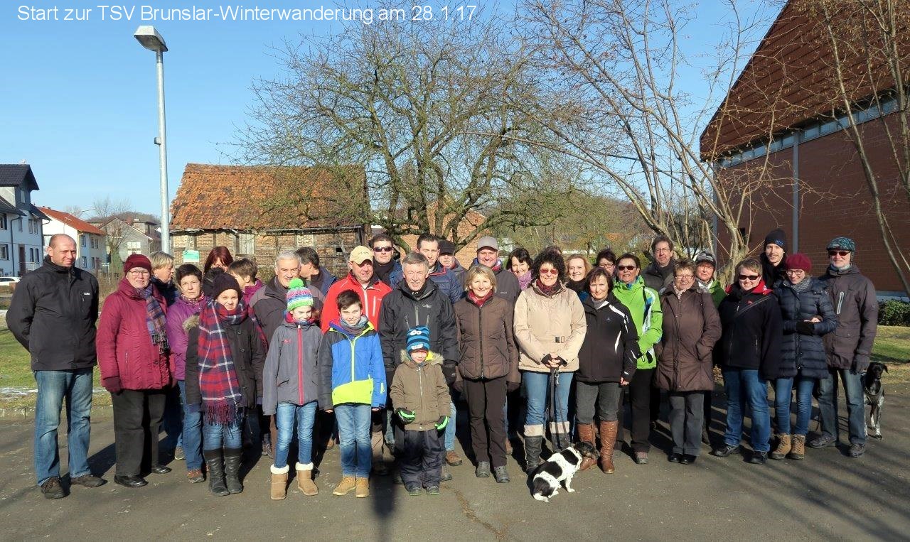 Bei bestem Winterwetter fand am Sonnabend, 28.1., die Winterwanderung unseres TSV Brunslar statt. Waren am Startpunkt um 12 Uhr vor der Sporthalle auch noch nicht alle da, so verstärkte sich die Gruppe unterwegs doch noch auf über vierzig Wanderfreudige. Auf der gut 10 km langen Rundstrecke ging es Richtung Mader Holz und daran entlang zum Zwischenstopp mit Imbiss. Über den Kirschberg ging es zurück zur Sporthalle, wo sich ein geselliger Nachmittag bei Kaffee und Kuchen und netter Unterhaltung in der Gymnastikhalle anschloss. Bei Bratwurst und kühlen Getränken ging es dann im Freien hinter der Halle noch munter weiter.
