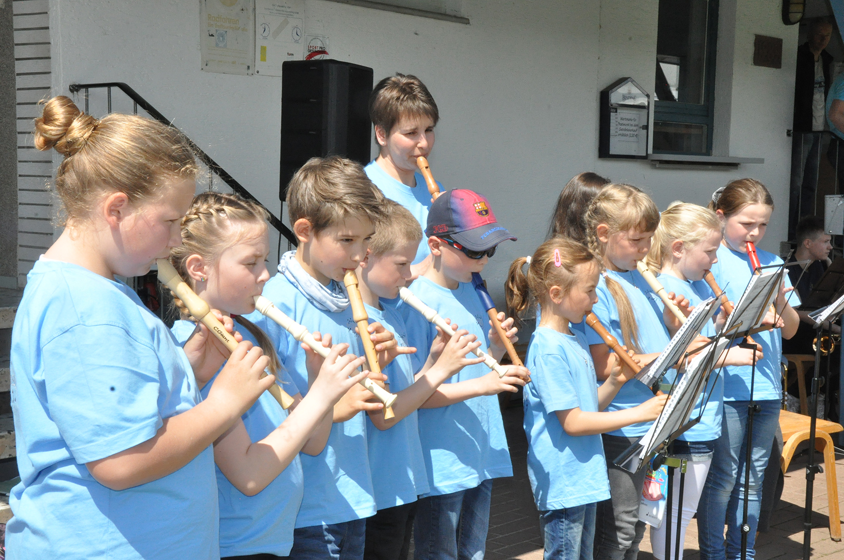 Bei (fast) optimalem Wetter zeigte zum Auftakt am Sonntagmittag Abteilungsleiterin Kerstin Fehr, was ihre altersmäßig gestaffelten Blockflötengruppen drauf haben. Das fing an bei den Jüngsten, die ab der ersten Klasse als AG im Familienhaus Brunslar das Flötenspiel erlernen. Nach den Blockflötenkindern unterhielt das Jugendorchester des Blasorchesters Brunslar unter Leitung seiner Dirigentin Alisa Walter die Zuhörerinnen und Zuhörer, die sich mittlerweile zahlreich auf den Festzelt-Garnituren niedergelassen hatten.