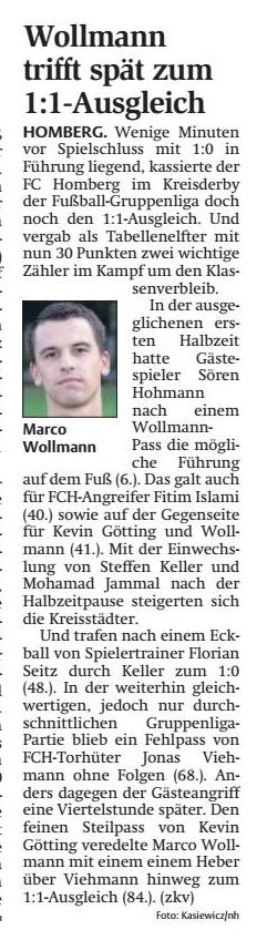 So.30.4., 15 Uhr: FC Homberg  I – SG Brunslar/Wolfershausen I in Homberg  1 : 1
