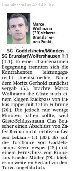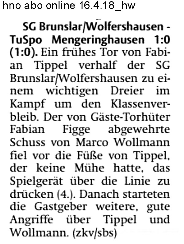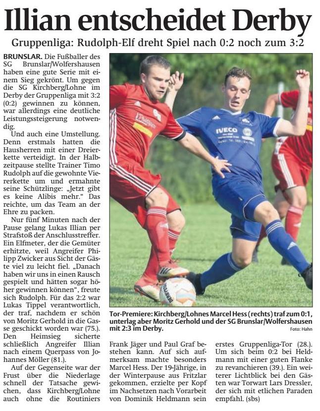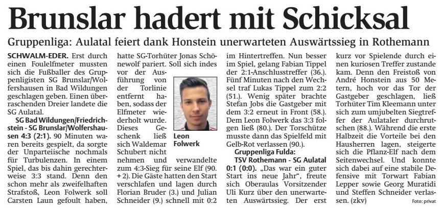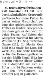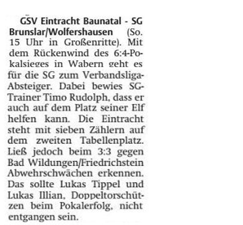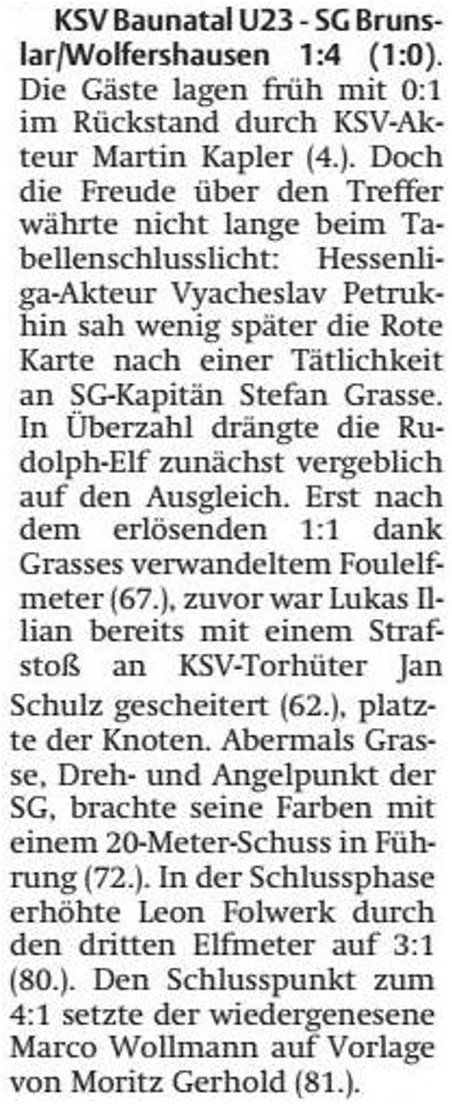 | 15:00 Uhr | SG Brunslar/Wolfershausen I | – | VfR Volkmarsen 0 : 2 |