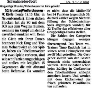 | 15:00 Uhr | TSV/FC Korbach | – | SG Brunslar/Wolfershausen I 3 : 2 |