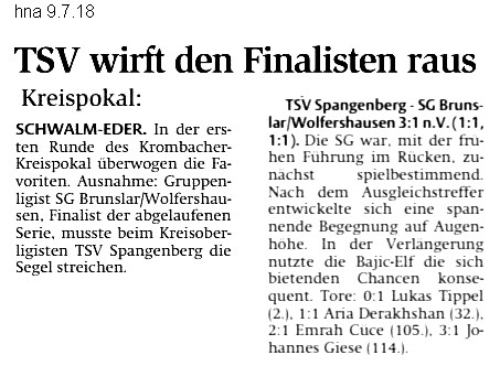Samstag, 07.07.18 16:00 Spangenberg I – Brunslar/Wolfershausen I (1. Kreispokalrunde) 3 : 1 (1:1) n.V