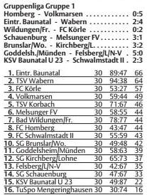 | 15:00 Uhr | 1. FC Schwalmstadt II | – | SG Brunslar/Wolfershausen I 3 : 1 |