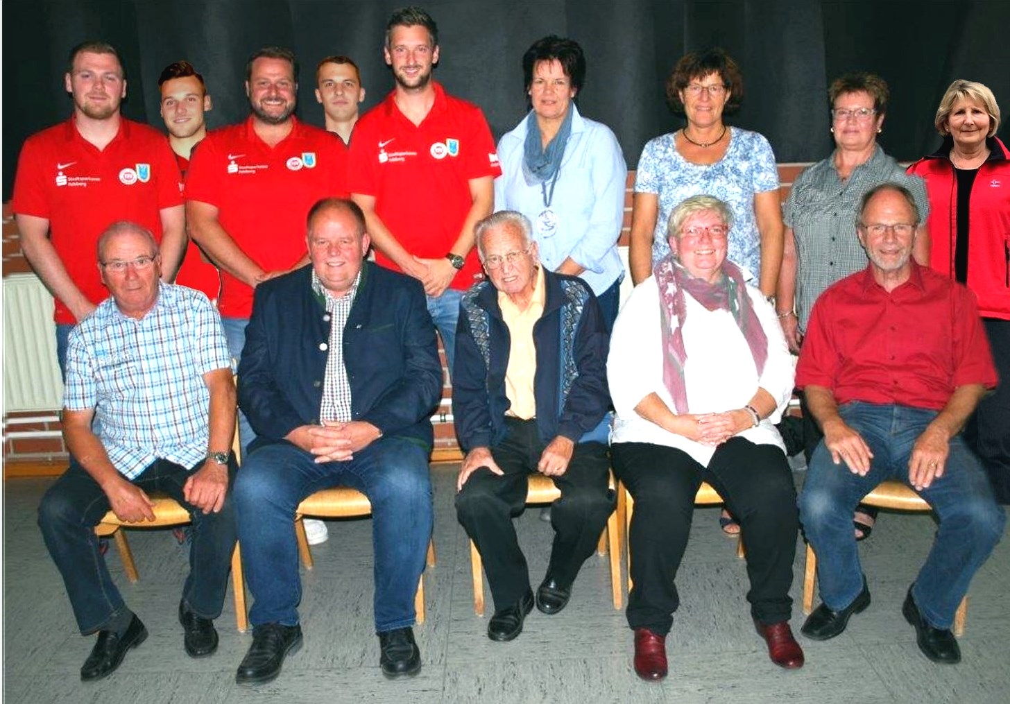 Unser erweiterter Vorstand im Okt. 2018: hi.v.l. Schriftführer Clas Beuscher, Beirat Kevin Götting, Abt.-Leiter Fußball Stefan Stock, Sportwart Marco Wollmann, Beirat Stefan Grasse, Abt.-Leiterin Blasorchester Anja Krug, Frauenwartin Kornelia Thiel, Abt.-Leiterin Gymnastik Sabine Kronsbein und Abt.-Leiterin Jedermannsport Erika Paul; vo.v.li. 2. Vorsitzender und Pressewart Hans Wilhelm, 1.Vorsitzender Dieter Matheiowetz, Abt.-Leiter Handball Heinrich Giese, Abt.-Leiterin Aerobic Ulrike Matheiowetz und Schatzmeister Helmut Freudenstein.