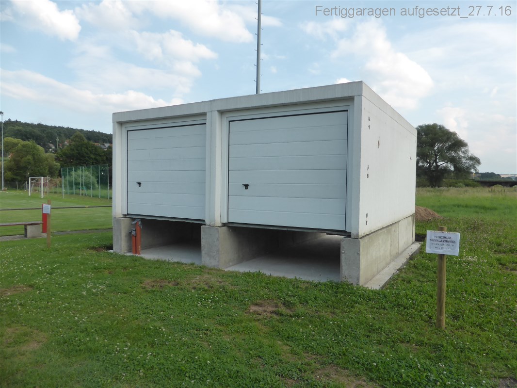 In aufwendiger Freizeitarbeit baute man am Sportplatz im Rahmen des Hochwasserschutzes ein Fundament, auf den zwei Fertiggaragen gestellt wurden, die künftig als Geräte- und Ballraum dienen sollen.