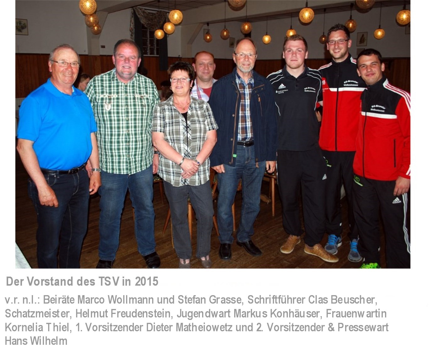 Vorne sitzend von links: Schatzmeister Helmut Freudenstein, Abt.-Leiterin Jedermannsport Erika Paul, 1.Vorsitzender Dieter Matheiowetz, Abt.-Leiter Handball Heinrich Giese; stehend von links: 2.Vorsitzender und Pressewart Hans Wilhelm, Abt.-Leiterin Gymnastik Sabine Kronsbein, Abt.-Leiterin Blasorchester Anja Krug, Frauenwartin Kornelia Thiel, Schriftführer Clas Beuscher, Beirat Stefan Grasse, Jugendwart Marcus Konhäuser, Abt.-Leiter Fussball Stefan Stock, Beirat Marco Wollmann und Abt.- Leiterin Aerobic Ulrike Matheiowetz.
