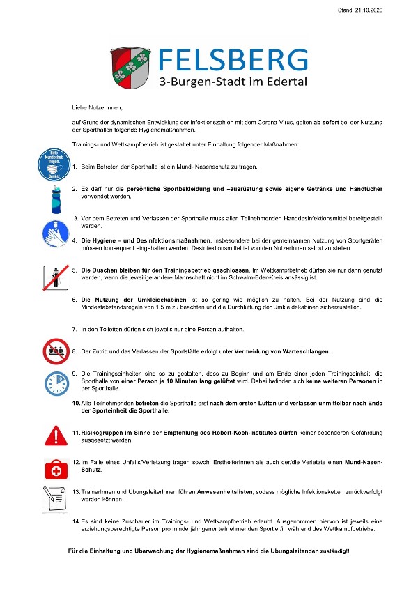 auf Grund der dynamischen Entwicklung der Infektionszahlen mit dem Corona-Virus gelten ab sofort für die städtischen Sporthallen die im Anhang befindlichen Hygienemaßnahmen.