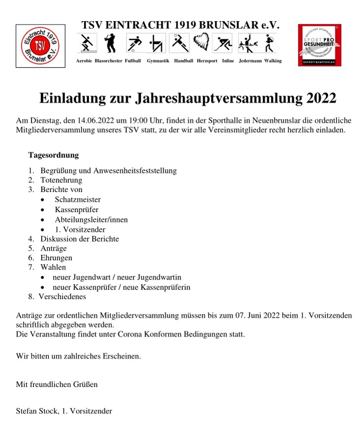 JHV 2022 am Di., 14.6., um 19 Uhr in der Sporthalle