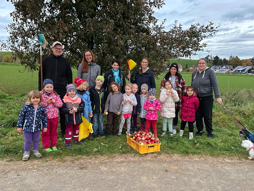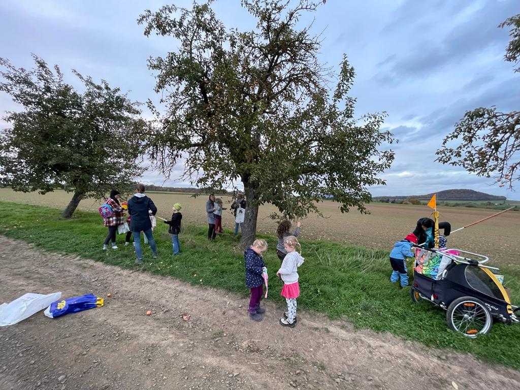 Die Übungsleiterinnen Martina Neitzel, Sabrina Pohl und Sarah Stöbel-Regula haben sich mit ein paar freiwilligen Kindern und ihren Eltern bei der Feuerwehr in Neuenbrunslar getroffen und sind von dortaus bepackt mit Tüten, Stiegen und Apfelpflückern hoch ins Strickerfeld gelaufen. Das Ziel: Die restlichen, noch an den Bäumen hängenden Äpfel vor ihrem Verderb zu retten.