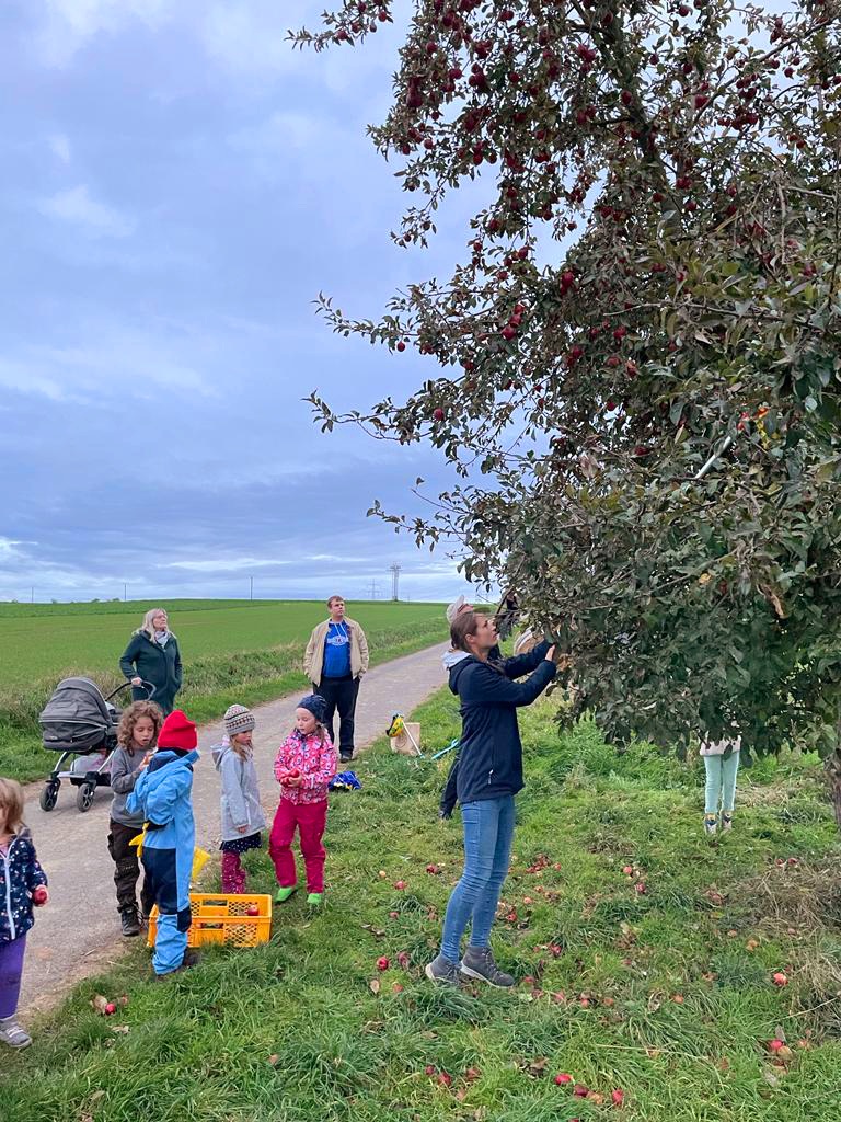 Schon bei der Ernte griffen sowohl die Kinder als auch die Eltern gerne zu und ließen sich den einen oder anderen frisch vom Baum gepflückten Apfel schmecken. Lecker!