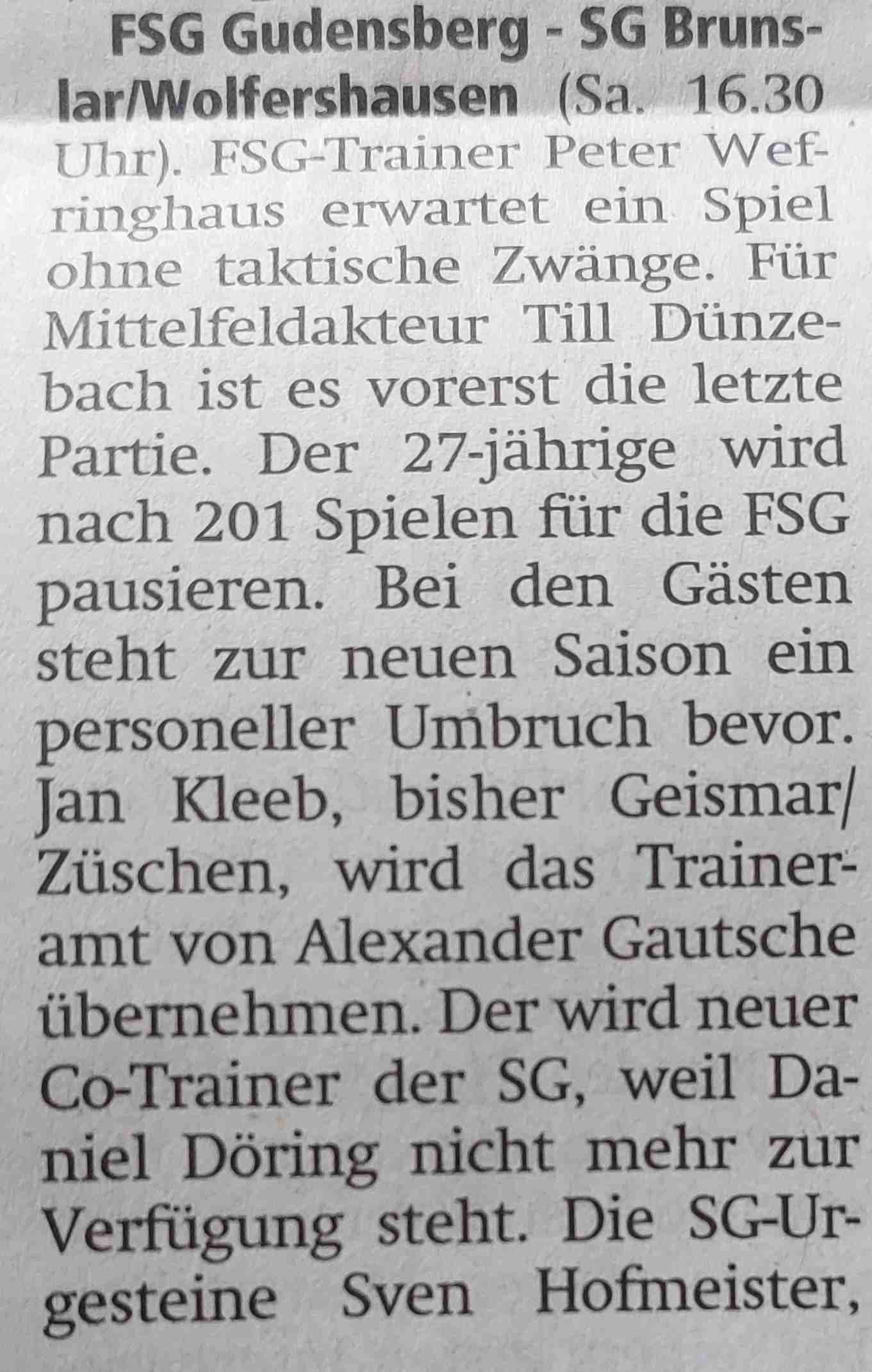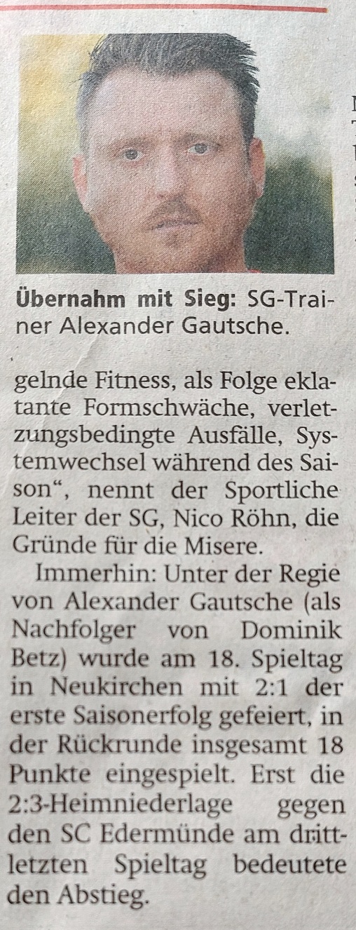 Gautsche (38) ist seit vielen Jahren als Coach im Senioren- und Jugendfußball aktiv, darunter Engagements beim damaligen Verbandsligisten FC Körle sowie beim Frauen-Hessenligisten KSV Hessen Kassel. Als bisheriger Co.-Trainer ist er mit der Situation des Tabellenletzten bestens vertraut. Das gilt auch für Daniel Döring, der in der Saison 2022/23 bei der SG Nachfolger von Timo Rudolph wurde. zWinterpause