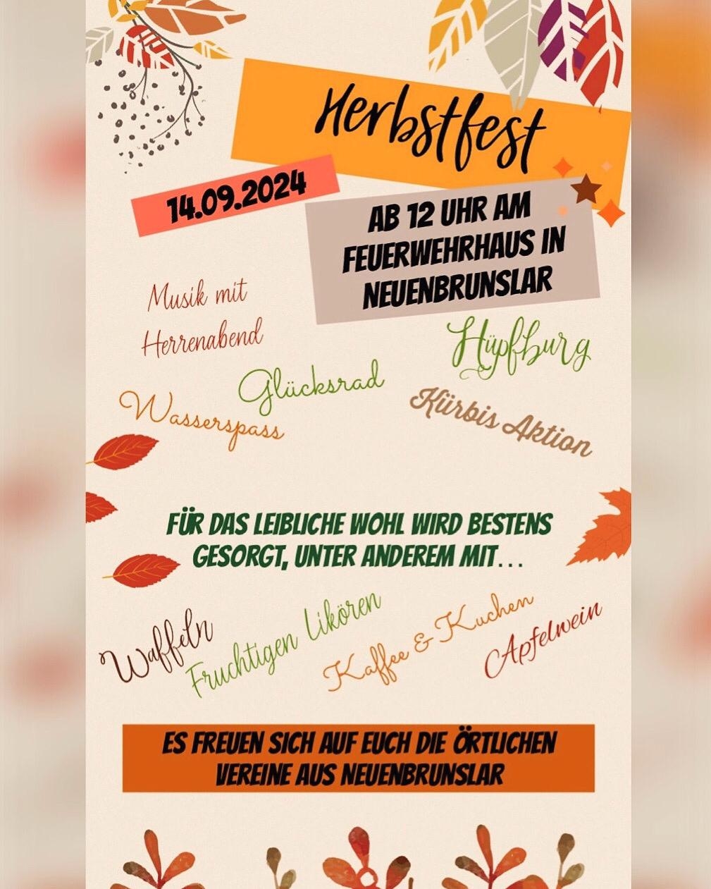 Am 14. September veranstalten die örtlichen Vereine aus Neuenbrunslar ein Herbstfest im Feuerwehrhaus in Neuenbrunslar und laden dazu alle Interessierten ein.
