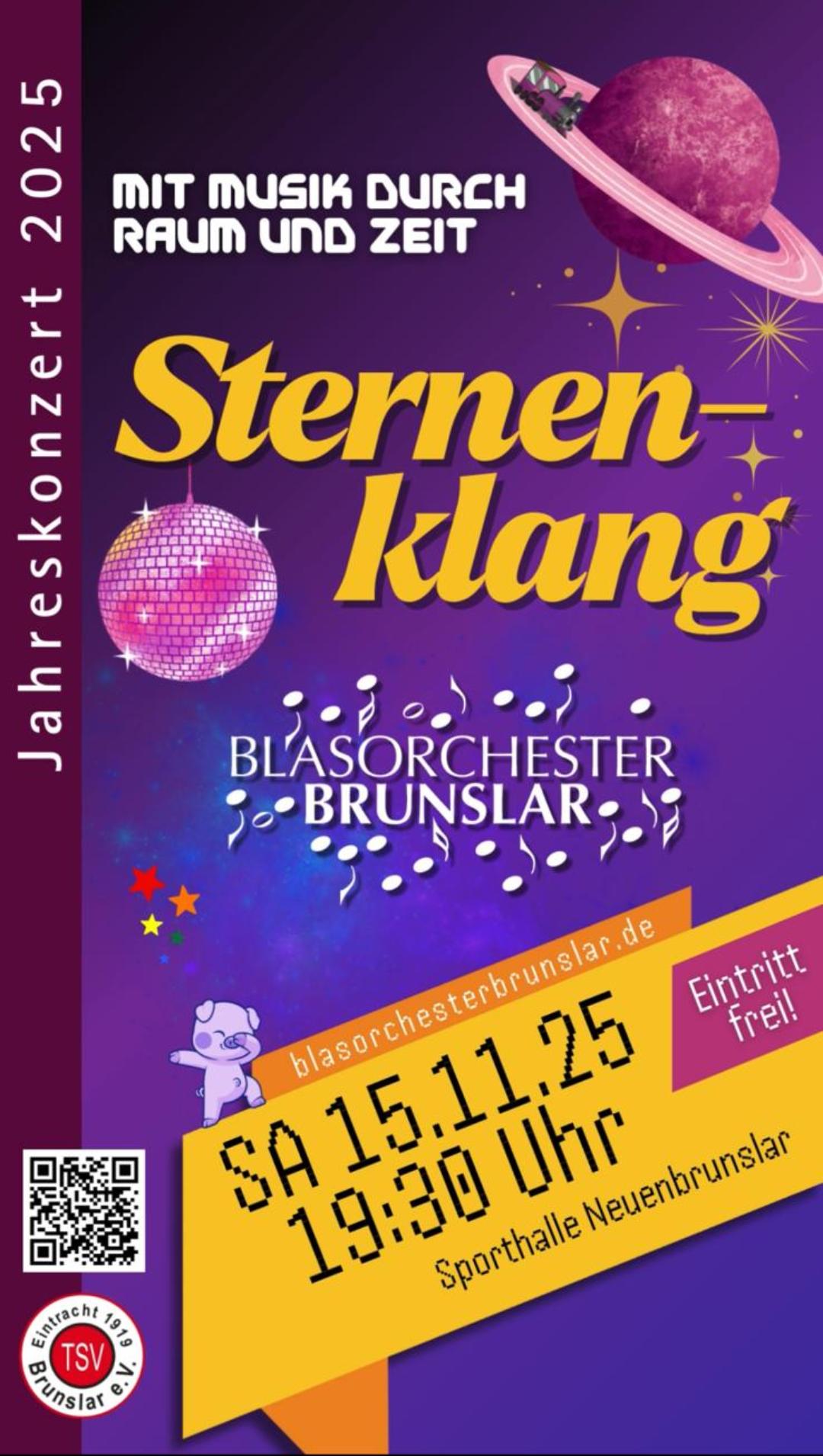 Am 15. November 2025 lädt das Blasorchester Brunslar zu einer musikalischen Reise durch Raum und Zeit ein. Auf dem Programm stehen Filmmelodien aus den unendlichen Weiten des Weltraums sowie unvergessene Hits vergangener Jahrzehnte. Titel aus Star Trek, Star Wars, Guardians of the Galaxy, Stücke von ABBA und sogar die Musik der Augsburger Puppenkiste lassen Kindheits- und Jugenderinnerungen lebendig werden.